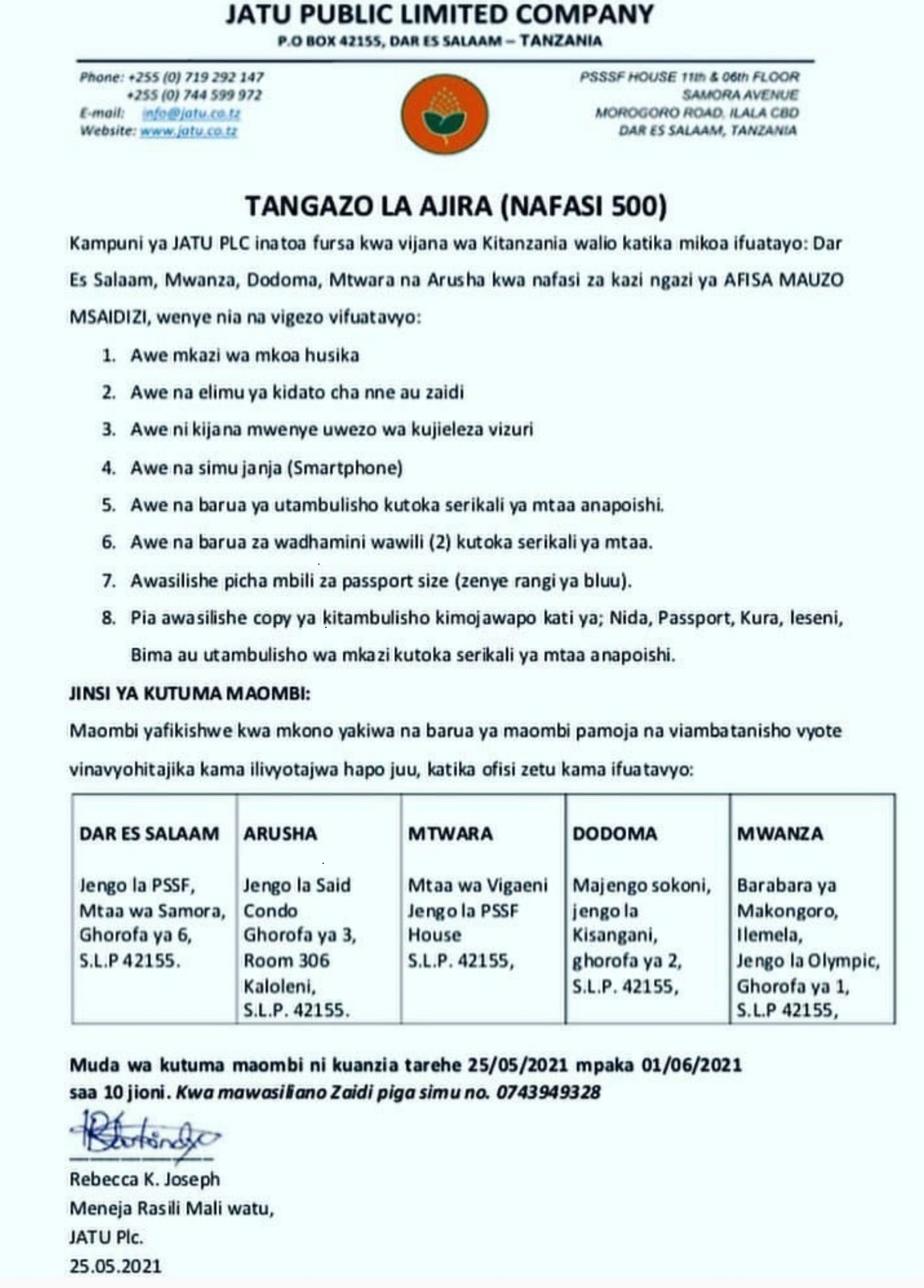 500 Jobs (Afisa Mauzo Msaidizi) at JATU PLC May, 2021 (Nafasi za kazi 500 JATU PLC) . JATU connects farmers and enables them to modernize agriculture and after the harvest the company buys all the produce and later prepares products that will be sold to members through the online trading system (network marketing)network marketing.